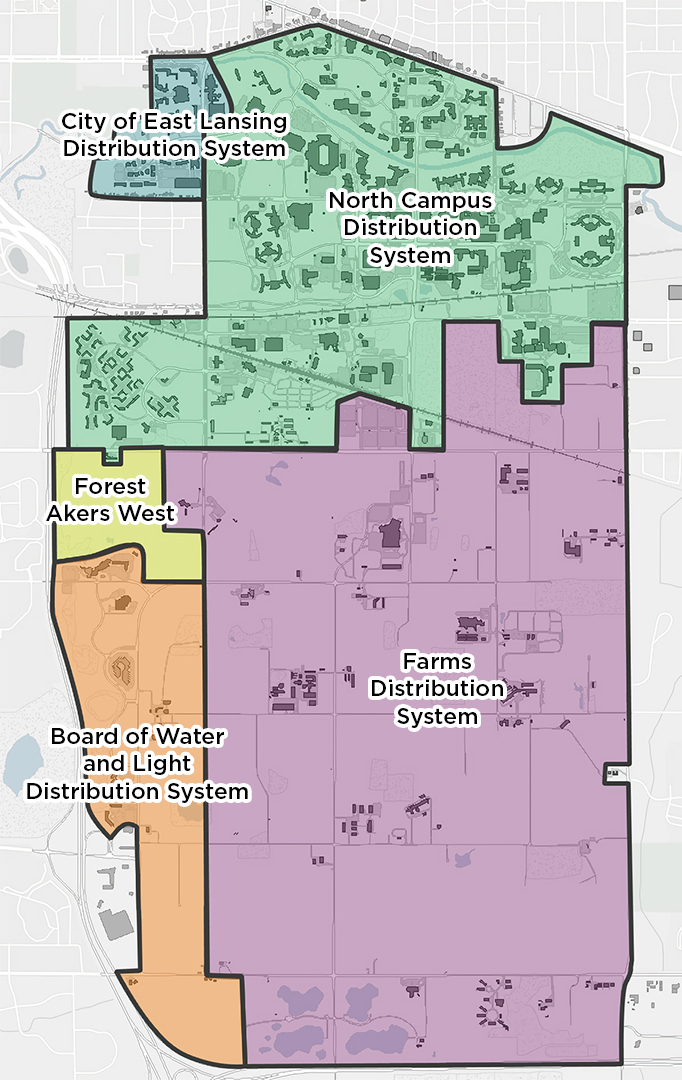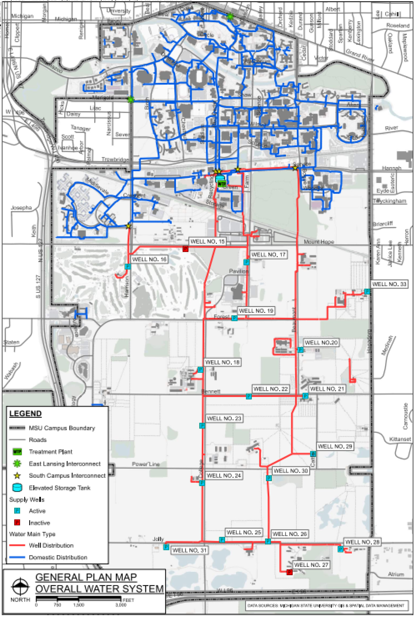 MSU operates 17 wells to supply the East Lansing campus with water. All of these wells are connected by a common water main distribution system. The south wells portion of the system collects water from the various wells and transports water to the water treatment plant. Along the path of water main, this system also provides drinking water to the various research farms and other facilities along the way to the treatment plant. The treatment plant removes Iron, Manganese, and Radium from the water. The water from the treatment plant is then sent to North campus for use.